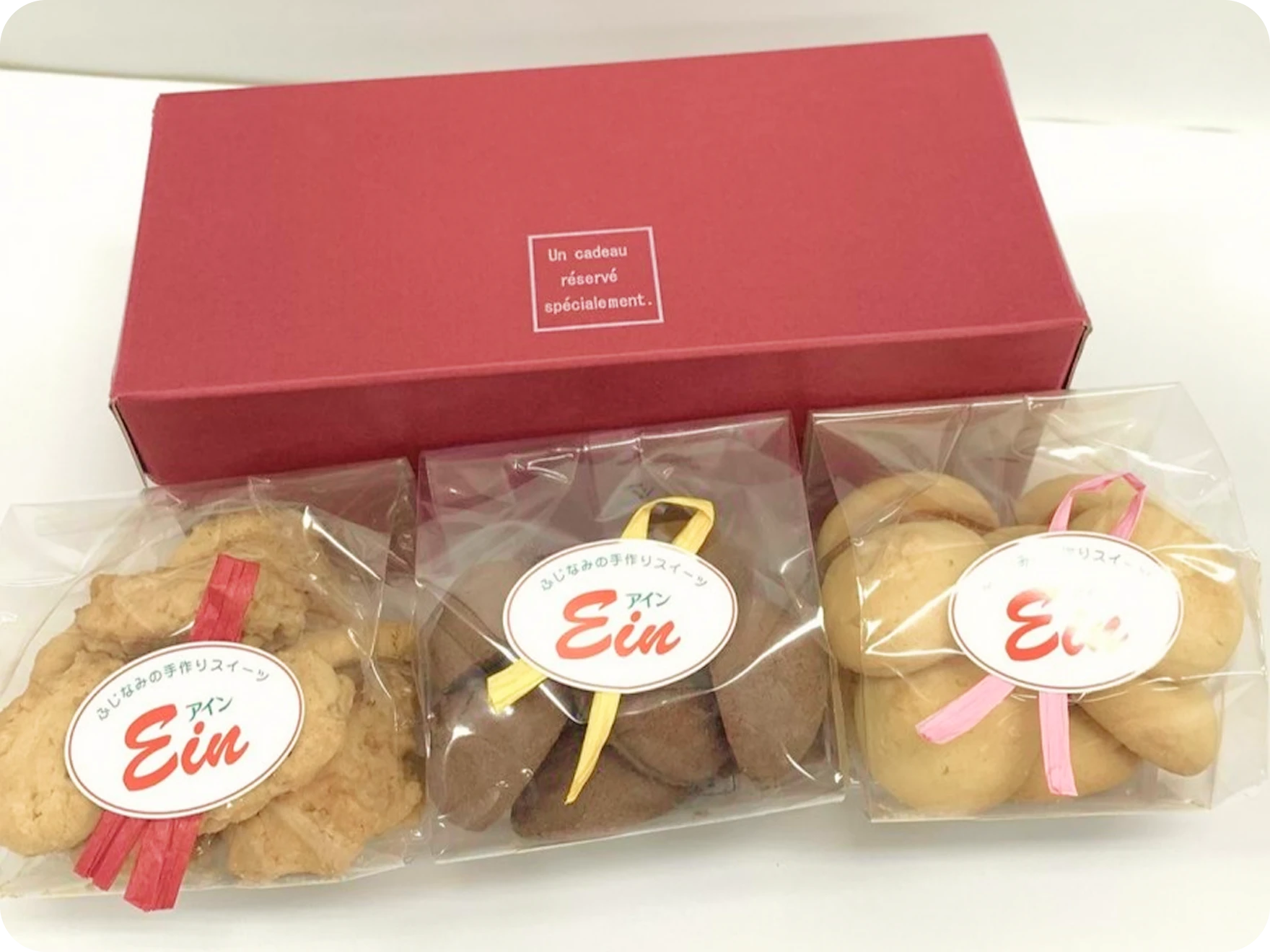 アインのクッキーは、自家配合の生地を一つひとつ丁寧に絞り出し、心を込めて焼き上げています。原料には良質な素材を厳選し、手作りならではの素朴で温かみのある味わいを大切にしています。