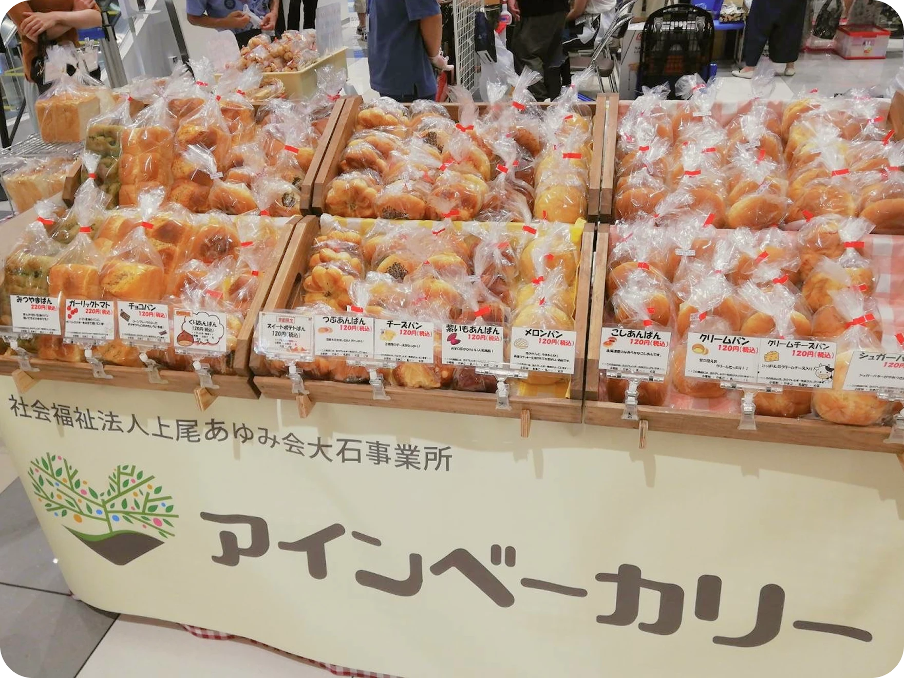 アインのパンは、自家配合の生地を丁寧に分割・成形し、具材を包み込んで発酵・焼き上げています。利用者の皆さんとともに試行錯誤を重ね、日々工夫を凝らしながら作り上げています。季節やイベントに合わせた限定パンもご用意しています。